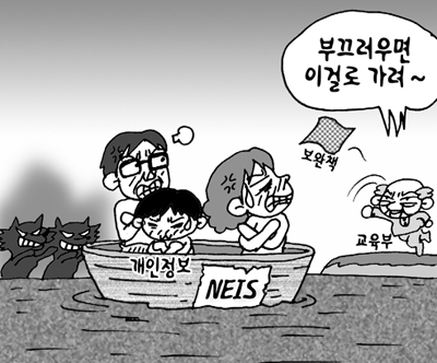 시민사회단체들이 윤덕홍 교육부총리와 NEIS 논란에 대한 면담을 가졌습니다. 이 자리에서 시민사회단체들은 NEIS의 반인권성을 지적하고, 중단을 요청했습니다. 교육부총리는 "NEIS는 실질적으로 교육현장에서 시행이 중단된 상태"라며 보완을 위한 심의기구 설치를 제안했습니다. 다음은 이 면담에 대한 참세상 뉴스의 보도내용입니다. 그림은 전북지역인터넷대안언론 <참소리>의 최인화 기자님께서 그린 만평입니다.